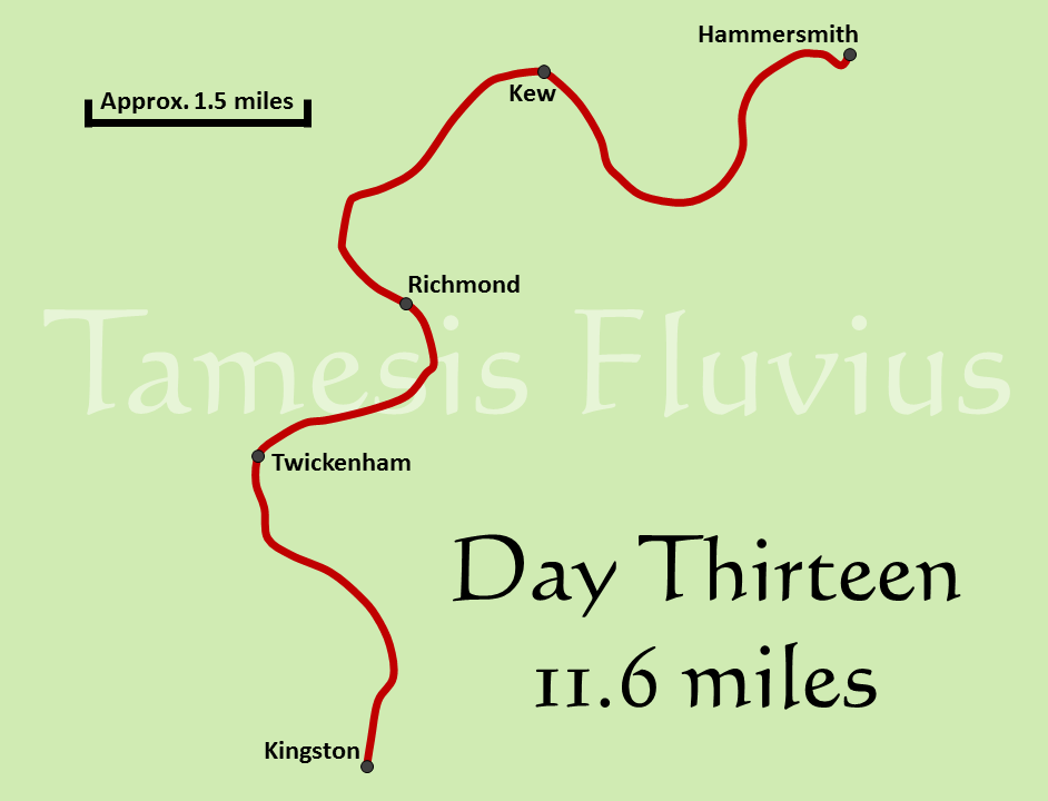 By Day Thirteen we were very definitely approaching the end of our journey, as the last three days were to be spent walking through London. Our original plan was for this section to be by far the longest of the three, covering more than thirteen and a half miles between Kingston and Putney. However, as we knew that we were facing a tube journey to our overnight accommodation at the end of the day it didn't really matter where we left the path and so a couple of days before getting to this stage, we changed our plans.