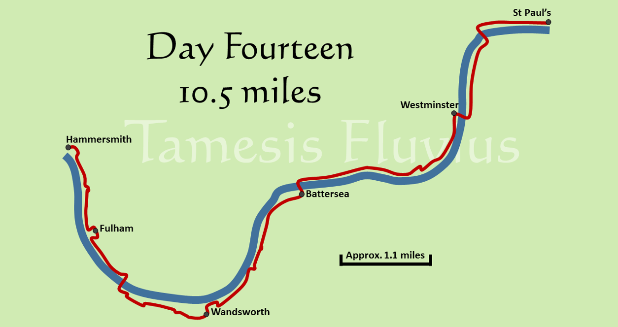 For the final two days on the path, we decided to make use of the fact that there were separate routes along both banks by crossing the river at a number of different places, depending on what landmarks there were to walk past or view from the opposite side. Because of this, the maps for these two sections show the river itself and path alongside it, indicating where we walked along the northern or southern bank. The route we decided on both started and finished to the north of the river, crossing four different bridges during the course of the day. Without the large green space of the previous day, it now really felt like London although apart from the occasional detour around a building, there was only one section of any significant length away from the river as we passed through Wandsworth.