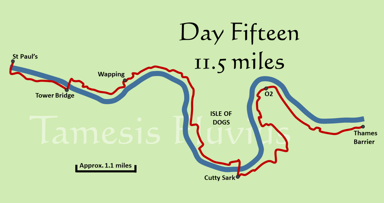 Two weeks on from leaving Oxford for the first time, we had arrived at the final stage of our journey to the Thames Barrier, with just a little over eleven more miles to the end of the path. It was another day when we had to decide between the northern and southern banks and stuck with the northern side for much of the route, largely in order to be able to walk through the foot tunnel at Greenwich. Sadly it was a day when we knew we would have to divert from the normal path for some time, as building work in Greenwich meant that a section of the route was closed. It was also a day when we encountered something which had been very rare during our trip, namely rain. Up to this point we had only had a few spots floating in the air between Henley and Marlow, which barely counted at all, but there was actually a proper rain shower on the final day although happily it was short lived.